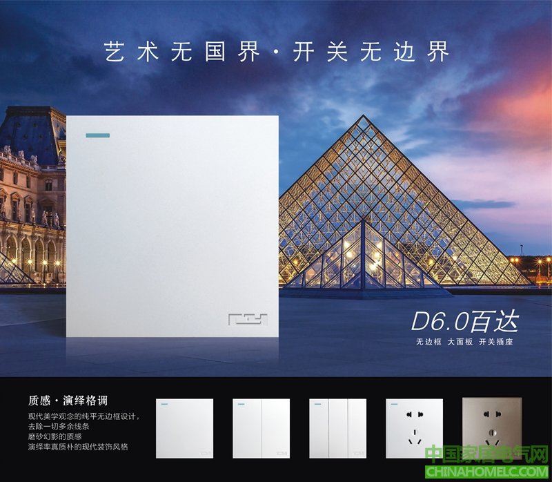 2017年,苍岳电器匠心打造D6.0百达系列,无边框大面板设计,简约大气!苍岳新款D6.0百达开关插座系列具有以下特点: