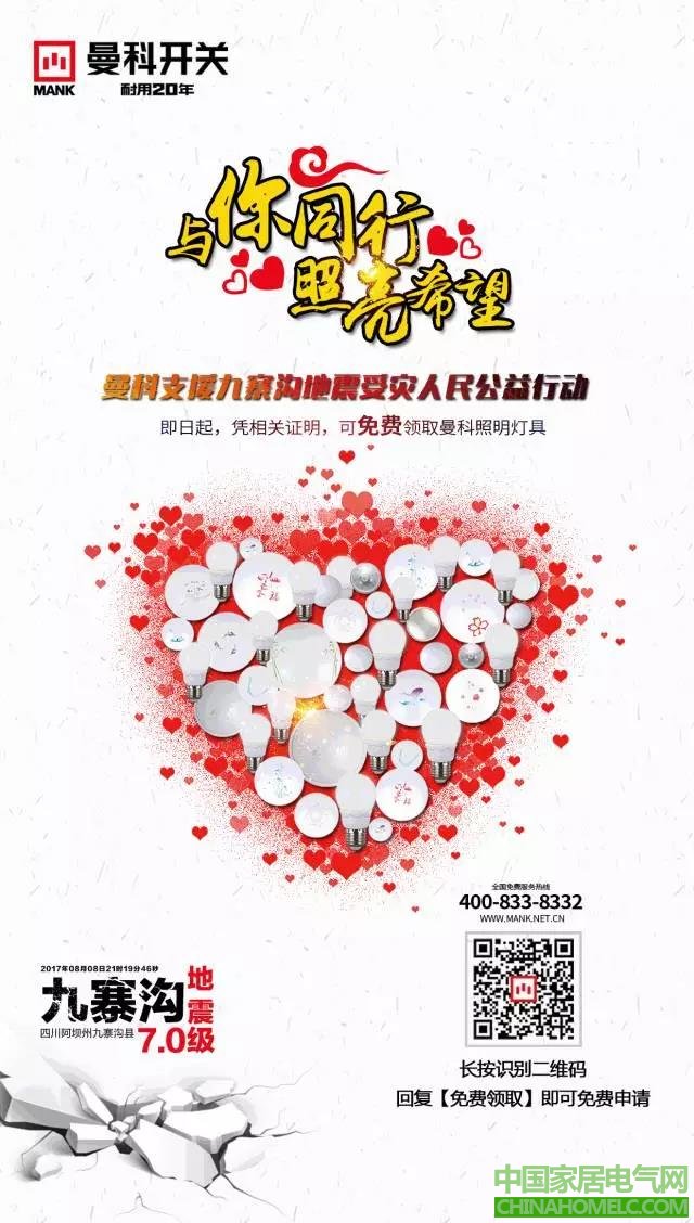 为了给灾后重建贡献一份力量,曼科启动了“与你同行 照亮希望”暨支援“8.8”九寨沟地震受灾人民公益行动,即日起至2018年2月28日,震区房屋严重受损的住户只要通过曼科开关微信公众号,就可以免费申请1套照明灯具,详细申请条件如下所示。