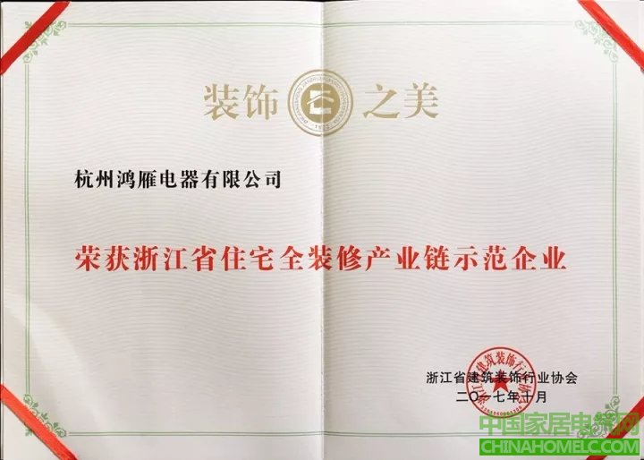 可以说,这些典型的案例是鸿雁智能家居成功打入市场的见证。而此次鸿雁电器荣获浙江省住宅全装修产业链示范企业,则是政府与社会给予的高度认可,同时也标志着鸿雁电器将在住宅全装修领域开启新的征程。