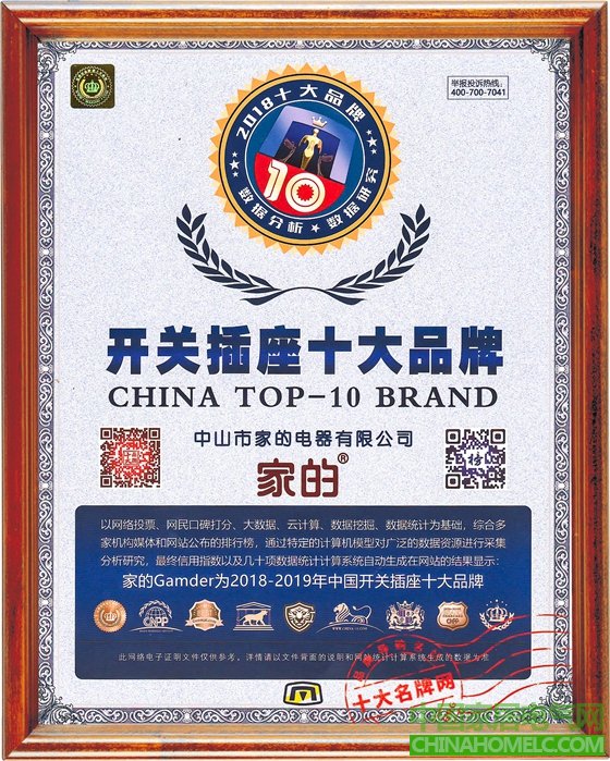 近期,家的开关,被评为“2019年开关插座行业十大品牌”。