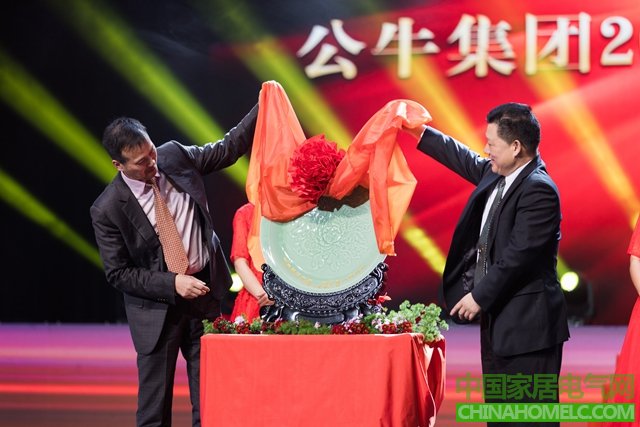 承载着市委、市政府领导的殷切期望,一首诗朗诵《心力量 新征程》,在营销副总裁李国强的带领下,说出了营销人员的心声。公牛的成绩,离不开23年来,遍布在全国乃至全世界各地营销人员的努力,当火红色的公牛旗帜在旗手的牵动下跃过大半个观众席来到舞台中央冉冉升起的时候,公牛人的自豪感跃然于心。随后,在高书记、项市长、孙主任、陈主席以及阮总的共同挥洒下,“百亿同舟 同心同行”八个金字耀然于台上,百亿庆典仪式将晚会推向了高潮。